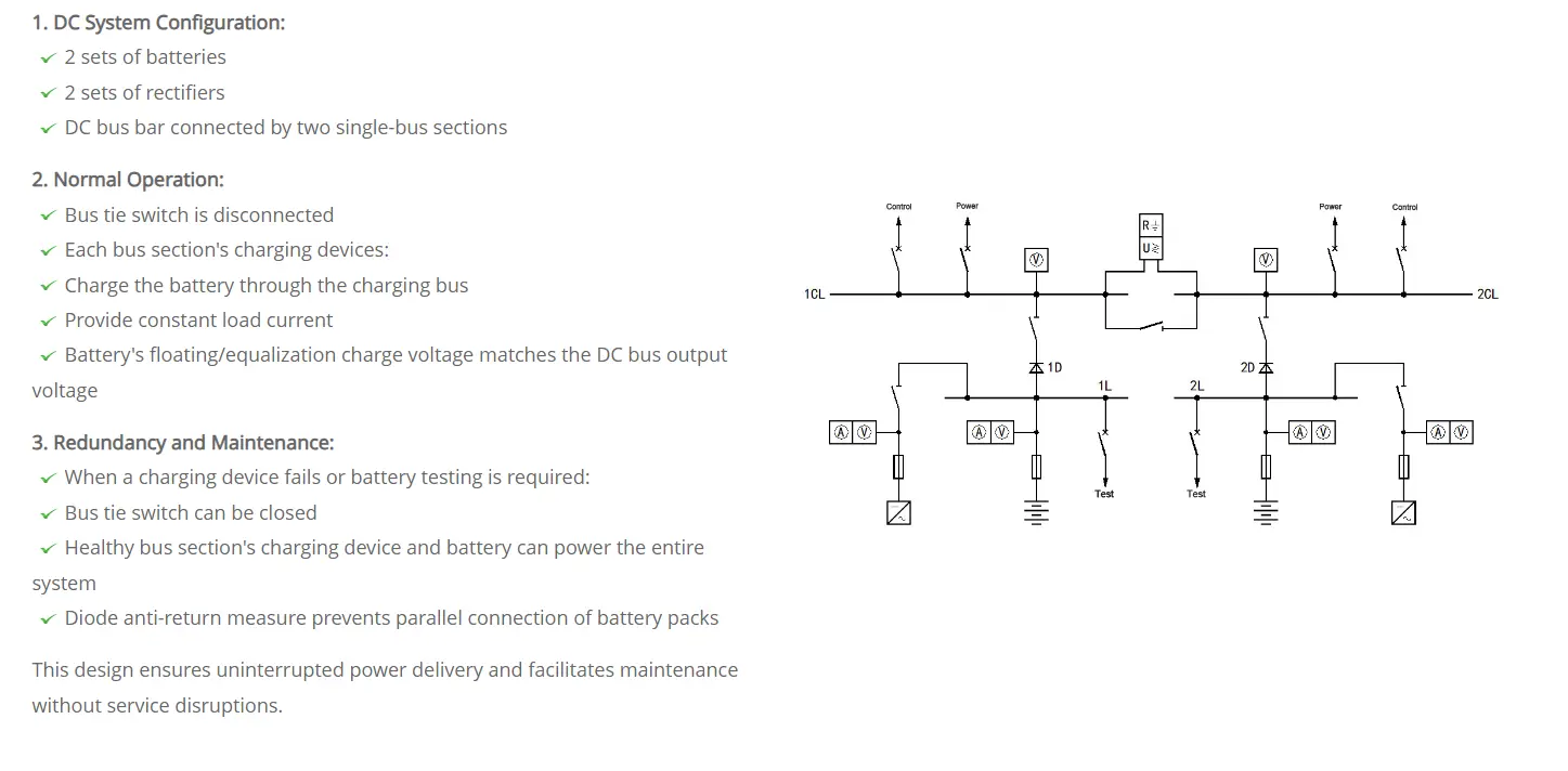 In normal operating mode, the AC power distribution unit channels grid electricity to the high-frequency rectification modules. These modules efficiently convert the alternating current into direct current, simultaneously charging the battery system and supplying stable DC power to the connected load through the DC distribution network. This seamless AC-to-DC conversion ensures uninterrupted operation, making the system well-suited for mission-critical applications requiring a reliable and consistent power supply.